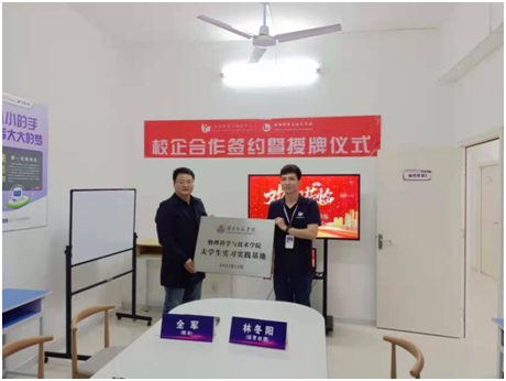 2022年1月6日,物理学院与湛江知否教育科技有限公司举行实习实践基地授牌仪式暨招聘宣讲会。出席活动的有学院党委书记陈碧琼、院长全军、副书记梁伟民、辅导员刘巍老师以及湛江知否教育科技有限公司总经理林冬阳、副经理宋越群、教学主任黄廉吴等校友。