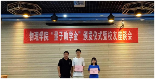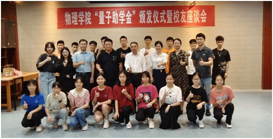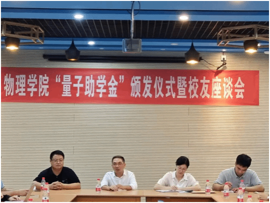 为对家庭经济困难学生进行帮扶资助,充分发挥优秀校友的榜样精神,激励学生勤奋学习,成长成才,弘扬传承好岭师物理人爱校荣校的光荣传统,9月9日上午,物理科学与技术学院于榕芳楼403室举行了“量子助学金”颁发仪式暨校友座谈会,邀请了优秀校友王海仁为同学们分享了宝贵的求学经历和高效的学习的方式方法。学院党委书记陈碧琼、院长全军、副书记梁伟民,学校校友办主任叶健仔、科长郭曌汾出席颁发仪式,学院全体辅导员和受助学生参与,梁伟民主持仪式。