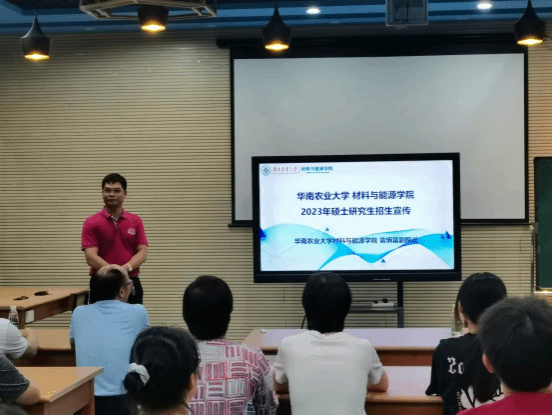 宣讲会伊始,雷炳富首先对华南农业大学的基本情况和材料与能源学院的专业特色、教师队伍、人才培养等发展概况进行了总体介绍,随后对硕士研究生招生的奖助体系及招生政策进行了细致解读,最后向同学们详细介绍了学院各专业的硕士招生、代表性科研成果、就业方向等基本情况,鼓励对材料与能源方向感兴趣的同学积极报考。