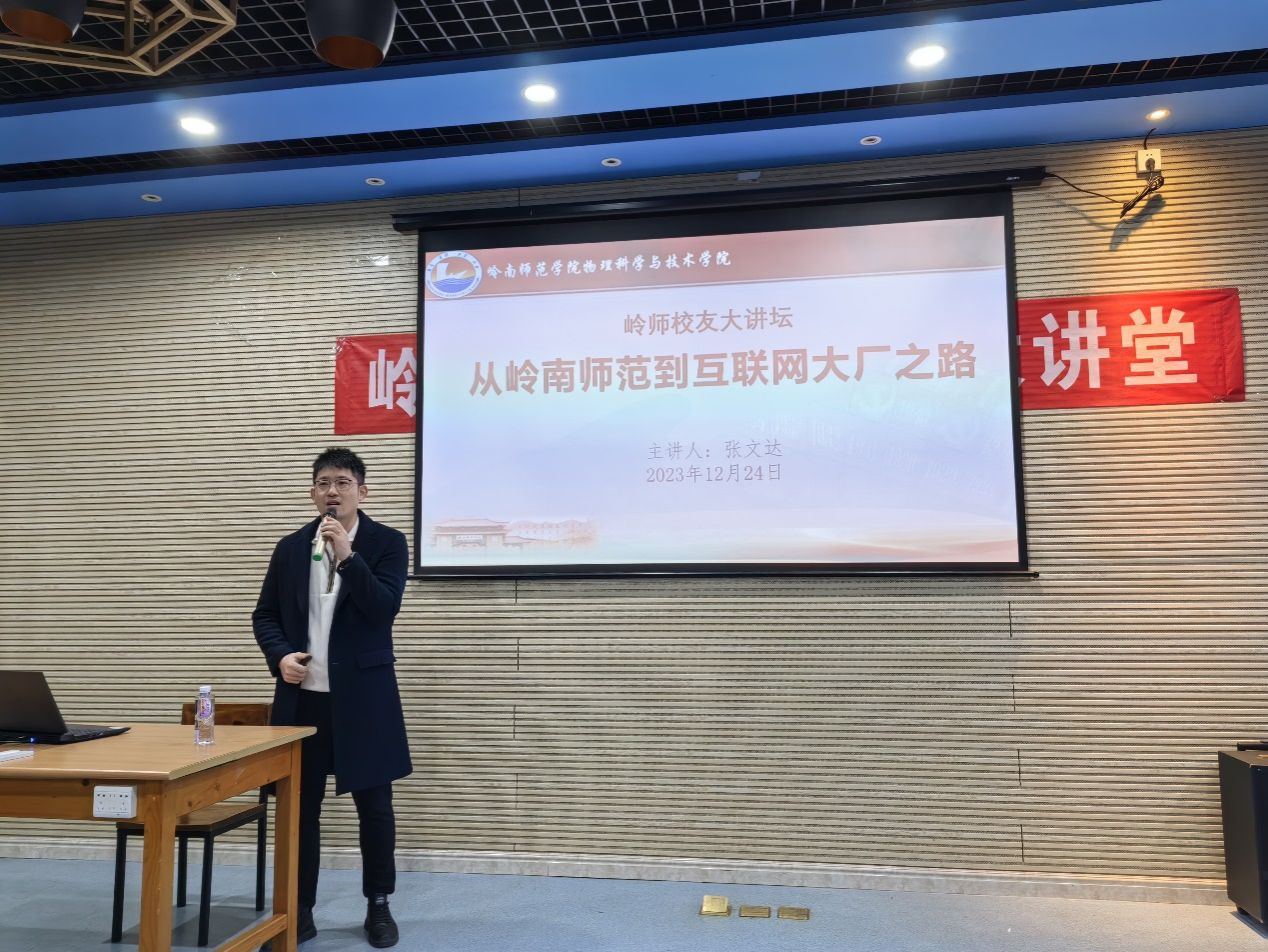 12月24日早上,物理科学与技术学院于物理楼403举办校友大讲堂活动,邀请广东宏义建筑科技发展有限公司、广州叁叁玖互联科技有限公司研发中心总经理兼总监张文达校友作主题为“从岭师到互联网大厂的成长之路”的专题报告。学院全军院长、党委副书记梁伟民和各年级学生参加报告会。