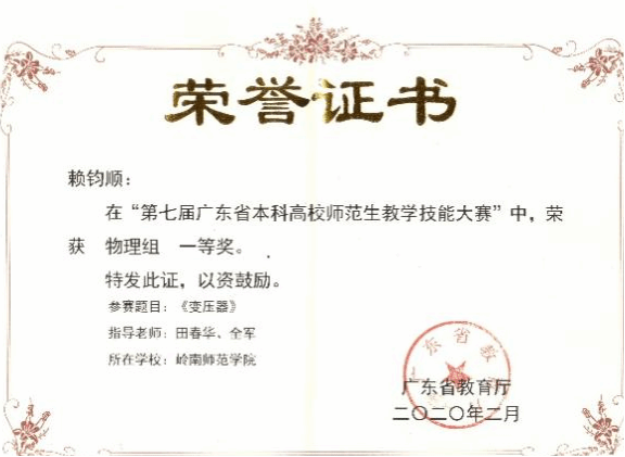 该专业在强化基础知识和教学技能的同时,注重创新意识和实践技能的培养。在全国和广东省高校师范专业教学技能、物理实验设计、“互联网+”、“挑战杯”等大赛中屡创佳绩。近五年来共获省级以上一等奖30余项,其中在广东省本科高校师范生教学技能大赛中连续三年获得一等奖。此外,本专业毕业生积极报考研究生,学生大都被南京大学、浙江大学、中山大学、哈尔滨工业大学、华中科技大学、湖南大学和华南师范大学等名校录取;考研录取率20%左右,连续多年名列学校前茅。