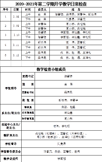 新学期开学第一天2021年3月8日,全军院长和陈碧琼书记带领学院全体领导班子成员,有序的开展了学期初的教学检查工作。特别对上午和下午的第一节课做了重点检查,全体成员早上7:45及下午14:15准时到教学楼开展教学检查。