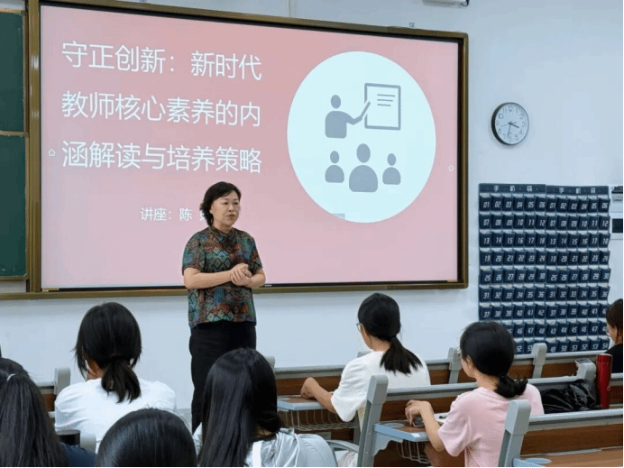 讲座伊始,陈婷以亲切平和的教态、准确清晰的语言,向同学们阐述了“新时代教师”的深刻内涵。她指出,“新时代教师”并非以年龄划分,而是指具备新时代所需的教育理念、专业素养与职业精神的教育工作者。她强调,当代教师应做到“守正创新”——守正道、传正能量,同时在教学方法与思路上勇于突破,以适应教育发展的新要求。