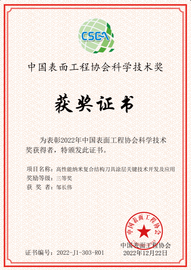 近日,中国表面工程协会公布了2022年度表面工程科学技术进步奖获奖名单,我校作为第一完成单位申报的成果“高性能纳米复合结构刀具涂层关键技术开发与应用”荣获三等奖,这是我校作为牵头单位首次获得的该类科技奖励。