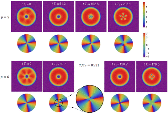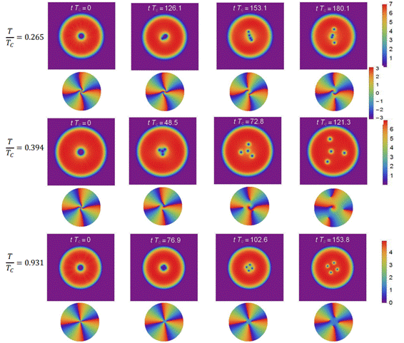 图2 初始加入随机微扰,三个温度下涡度为4的量子化涡旋的分裂过程。图中显示的是超流凝聚值和相位随时间的变化情况。