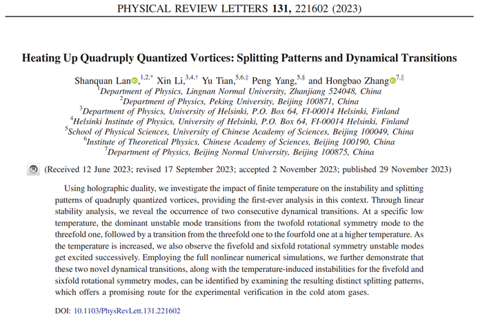 近日,我校物理科学与技术学院、相对论天体物理重点交叉学科的蓝善权博士(第一作者)在物理学顶级期刊Physical Review Letters(中科院一区Top期刊)上以岭南师范学院为第1单位发表了题为“Heating up quadruply quantized vortices: Splitting patterns and dynamical transitions”的研究论文。文章首次在数值模拟中发现了涡度为4的量子化涡旋新的分裂模式,同时揭示了分裂模式会因温度变化发生转变。