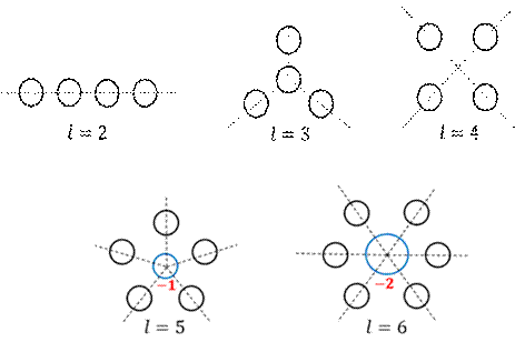 图1 量子涡旋的能量正比于其涡度的平方,据此可以计算出只有图中5种分裂方式是可能的,因为其中量子涡旋的能量总和小于涡度为4的量子涡旋的能量。