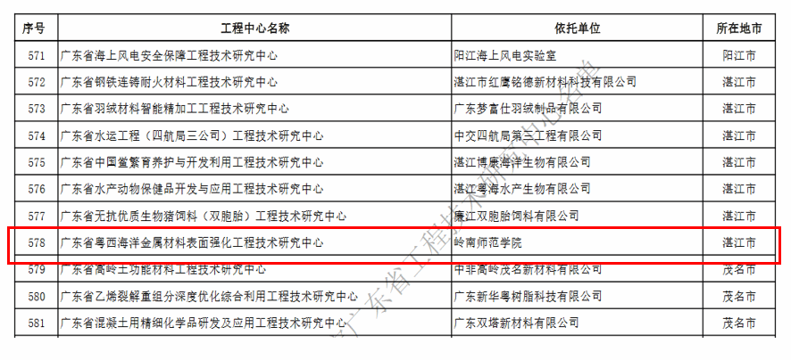4月7日,广东省科技厅公布了2023年度拟认定的广东省工程技术研究中心名单。我校物理科学与技术学院邹长伟教授负责的“广东省粤西海洋金属材料表面强化工程技术研究中心”拟获批认定。这是学校省冲补强重点学科“材料科学与工程”平台建设和科技社会服务的重要标志性成果,也是学校材料与化工专业硕士学位点和湛江湾实验室共建的重要平台,为以后学校深入开展产学研和硕士点建设夯实了基础。