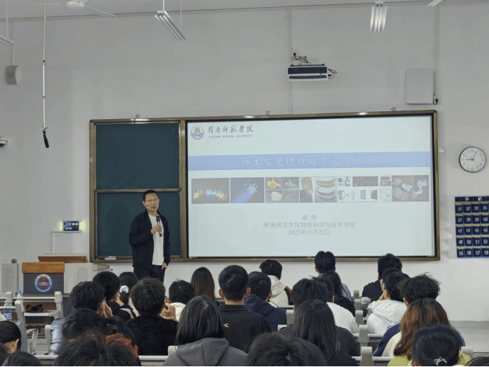 为拓展学生学术视野,激发科研创新热情,11月22日上午,物理学院在湖光校区励学楼101成功举办第四期“励学讲坛”。本期活动特邀谢伟教授作题为“稀土发光材料的研究与应用”的专题报告。学院党委副书记梁伟民与百余位2024、2025级学生代表共同参加。