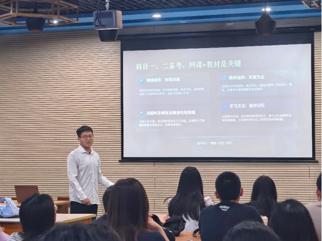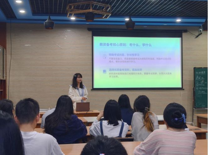 随后,22级张苑分享考编经验,为大家详细梳理了考编信息获取与备考策略等内容;23级李更分享其教资与四六级的备考经验,围绕“考什么,学什么”的核心,给大家带来了学习资料选择、复习时间分配、答题技巧、心态调整等方面的经验;23级于存阔结合自身经历,分享其从笔试到面试的教资备考经验。