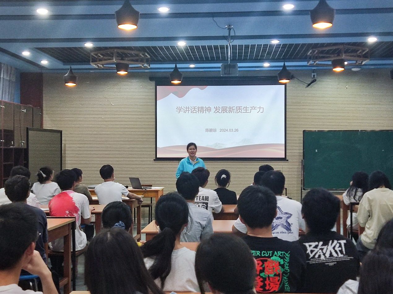 “什么是新质生产力?为什么要发展新质生产力?高校怎样服务发展新质生产力?发展新质生产力青年当何为?”,陈碧琼指出,“新质生产力”是目前备受关注的热词之一。习近平总书记在不同场合,多次就“发展新质生产力”作出重要论述、提出明确要求,同学们要深入学习贯彻习近平总书记关于发展新质生产力的重要讲话精神,深入了解科技创新对人才的需求。鼓励同学们弘扬科学家精神,认真做好大学规划,自觉自省、自律自强、自我认同,通过专业学习、社会实践、参与科研、参加竞赛、升学深造等练就过硬本领,成为适应新质生产力发展要求的高素质人才,为强国建设贡献青春力量。