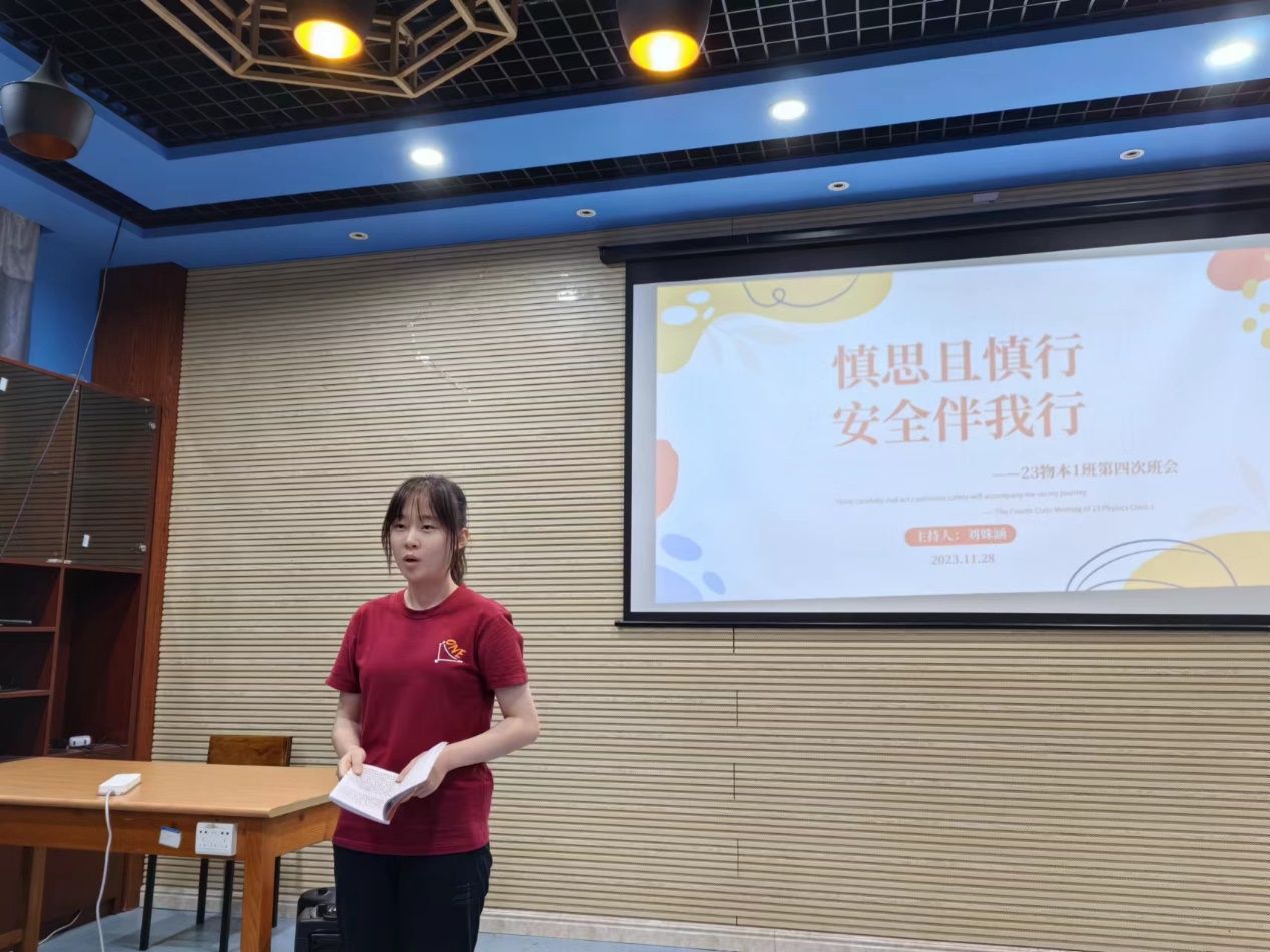 为提高同学们的安全防范意识,助力同学们健康成长。11月28日,2023级物本1班在物理楼403召开第四次班会。此次班会以《慎思且慎行,安全伴我行》为主题,莅临此次班会的嘉宾有学院党委梁伟民副书记、班主任朱旭鹏老师、辅导员刘巍老师及助班王骏鸿师兄。此次班会由班长刘姝涵主持。