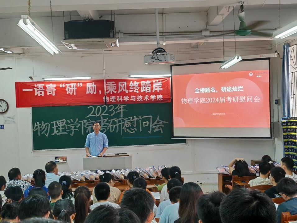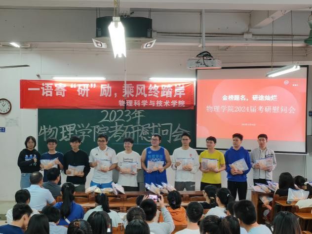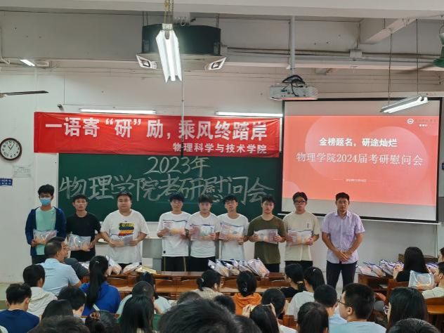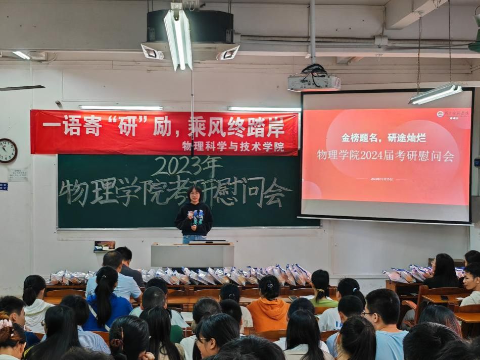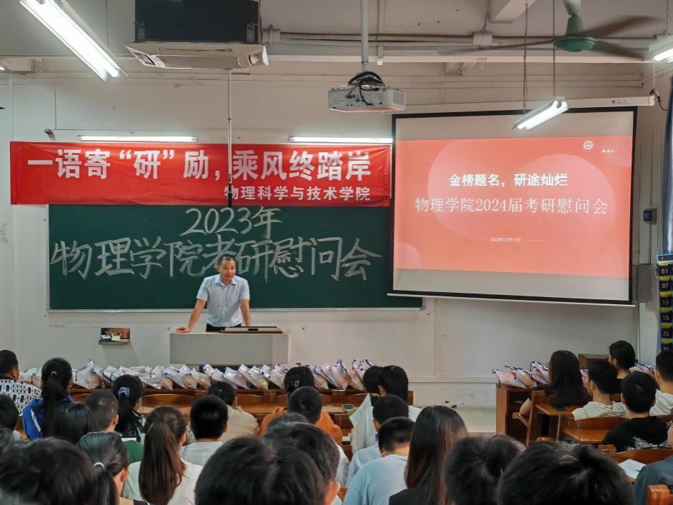 为帮助考研学子缓解备考压力,坚定考研信心,积极冲刺迎考,2023年12月15日,物理学院于教一107室举行2024届考研动员慰问会。学院院长全军、副院长邹长伟、系主任、辅导员以及20级考研学子等出席本次大会。会议由学院党委副书记梁伟民主持。