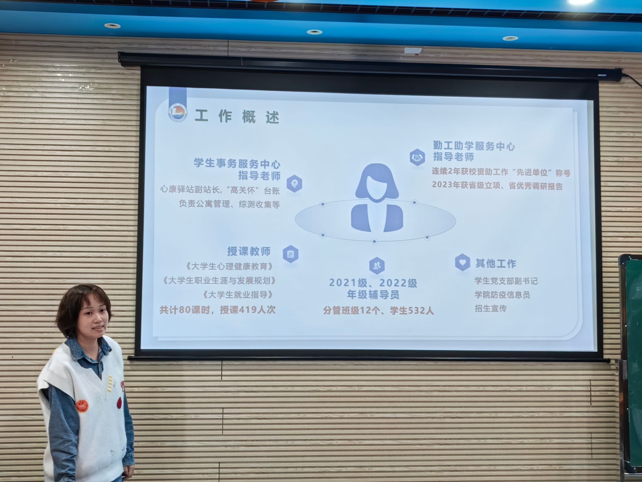 陈碧琼就大家的工作汇报给予总体评价并对下阶段工作提出殷切希望,希望通过本次述职汇报,各位辅导员要学会总结,加强相互交流学习,相互借鉴,不断调整工作方式方法,在接下来的工作中更加细致,更加有效率,不断创新工作方式方法,力求进一步提升各位辅导员老师的教育和管理水平,从而更好地构建服务发展型的学生工作体系。