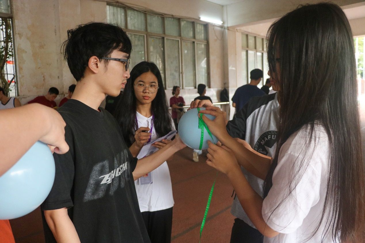 “气吞山河,气吐虹霓。”在吹气球比赛的现场,同学们接连“一鼓作气”,一吞一吐间,气势如虹,气球不断向外“生长”,势如破竹。班级最终的胜利,取决于气球周径的总和,而气球周径的总和,体现的却是同学们团结的力量。
