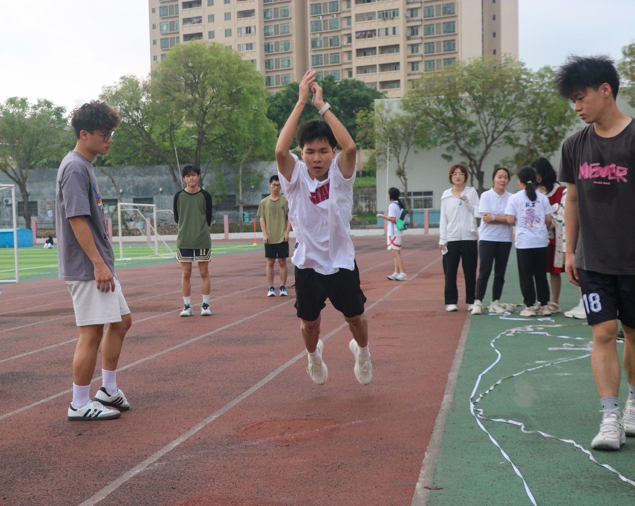 这是一场考验爆发力的赛事,不仅决胜在分秒之间,还在平日刻苦训练的每个瞬间,各班队伍的跳远运动员们,一个接一个,从全力起跳到潇洒落地,他们在腾空中接力前行,共同创造新的佳绩。