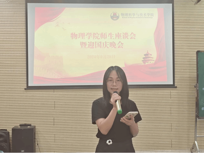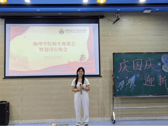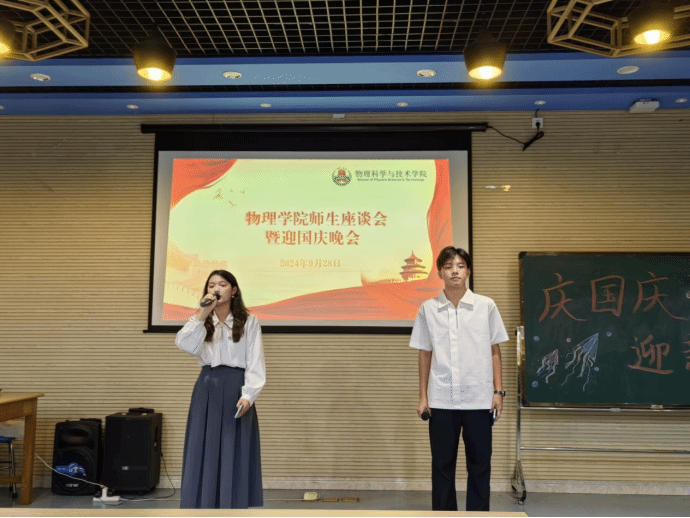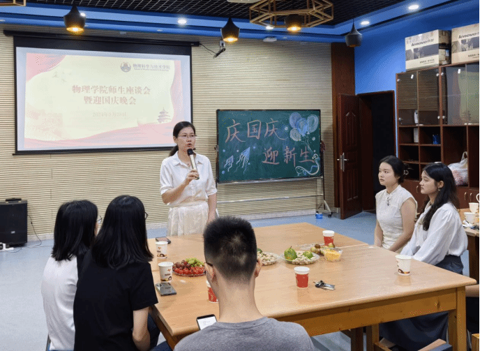 师生齐聚一堂,共庆祖国华诞。9月28日,物理学院在物理楼403举办了师生座谈会暨迎国庆晚会,学院党委书记陈碧琼、党委副书记梁伟民、新生班主任、新进教师、辅导员和2024级留校学生代表参加了活动。