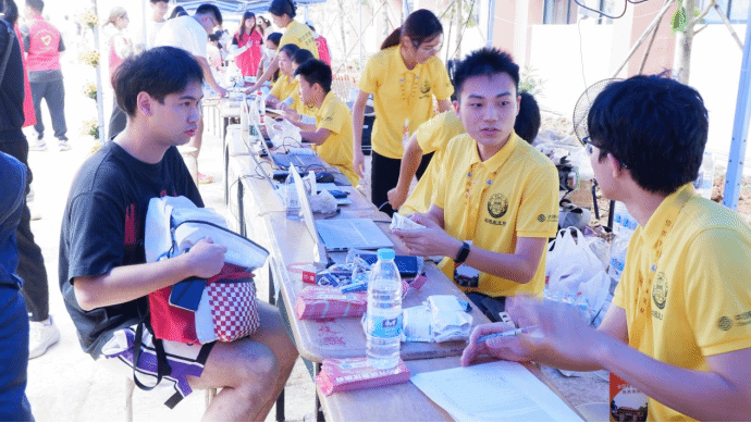 助班师兄师姐们耐心为新生答疑解惑,帮助他们办理入学手续。新生注册、登记住宿、上交材料、领取物品,把迎新棚变成敞开的家门。