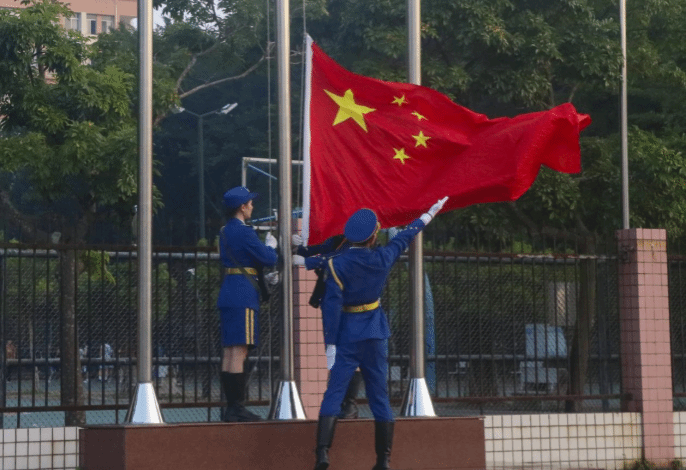 伴随着《歌唱祖国》的乐声,国旗护卫队的队员迈着整齐划一的步伐向升旗台行进。