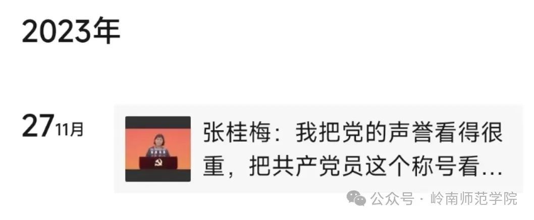 打开黄庆年的朋友圈,可以看到一条置顶视频,那是由共青团中央发布的张桂梅校长的一次演讲视频,标题是《我把党的声誉看得很重,把共产党员这个称号看得很重》。而转发的那天,2023年11月27日,是他成为中共预备党员的日子。“张桂梅校长的故事深深感动着我。我要坚守教育初心,做一名理想信念坚定的共产党员,做党的创新理论的信仰者传播者。”黄庆年如是说,眼里闪烁着坚定的光芒。