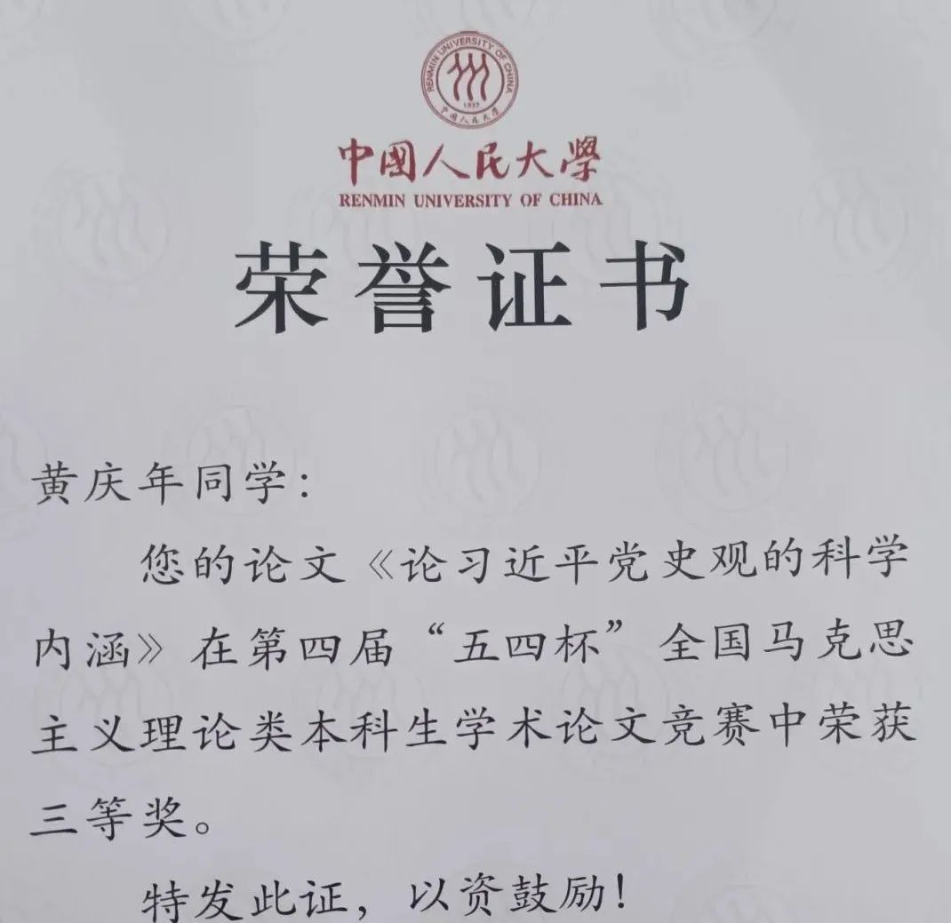 大二下学期,黄庆年独立撰写的学术论文《论习近平党史观的科学内涵》荣获中国人民大学主办的第四届“五四杯”全国马克思主义理论类本科生学术论文竞赛三等奖,和全国众多的马院本科生学子一同角逐该竞赛并获奖,这一经历极大地提升了黄庆年的自信心,让他更加坚定了攻读马克思主义理论学硕的决心。