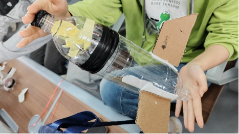最后,大家一起进行放飞“不开心”水火箭实验。在心康部成员的帮助下,同学们以小组为单位制作属于自己的水火箭,在便利贴上写下自己的烦恼、想丢弃的负面情绪,贴到水火箭上,再将水火箭发射出去,寓意抛开烦恼、轻装前行。