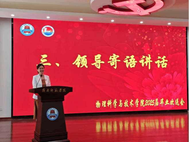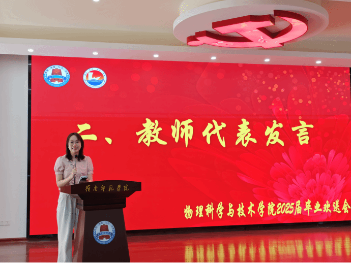 欢送会上,辅导员曾思境作为教师代表向毕业生深情寄语,送上四点嘱托:其一,永葆对世界的好奇与探索热忱,以一颗求知之心勇敢开启人生新征程;其二,既要脚踏实地,在未来道路上务实奋进,也要守护心中理想,在现实与热爱间找寻平衡;其三,希望同学们兼具物理学科锤炼出的坚韧意志,成长为有温度、敢担当的奋斗者;最后,她温情告白,物理学院永远是学子们的精神家园,欢迎毕业生常回 “家” 看看。