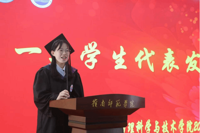 毕业生代表柯丽芳分享了自己在物理学院的快乐生活和成长感悟。发言中回顾了校园生活的点点滴滴,充满了对母校、家长、老师和同学们的感恩之情,表达了对未来的信心与期待。