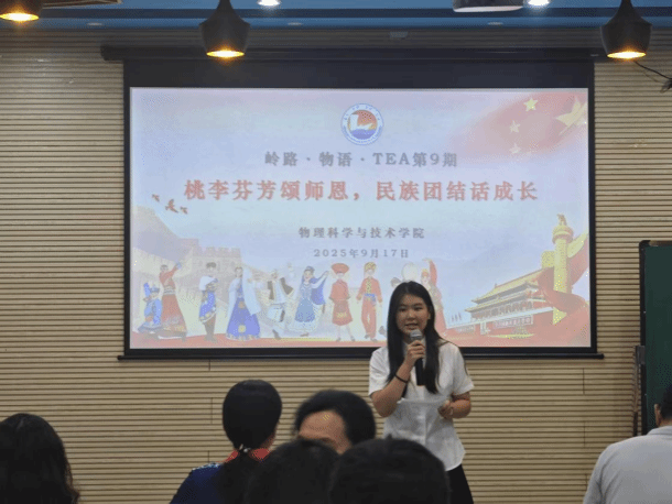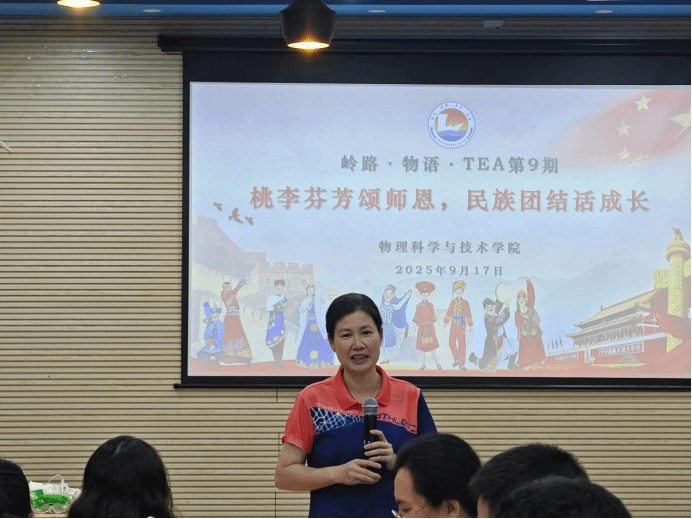 为弘扬尊师重教传统,深化民族团结教育。近日,“岭路・物语・TEA” 第9 期主题活动以 “桃李芬芳颂师恩,民族团结话成长” 为核心,在物理楼403温馨开展。活动邀请学院党委书记陈碧琼、党委副书记梁伟民、副院长田春华、学院优秀教师和新进教师代表、各民族学生骨干共 50 余人齐聚一堂,以茶为媒,共话师生情、共叙团结意。