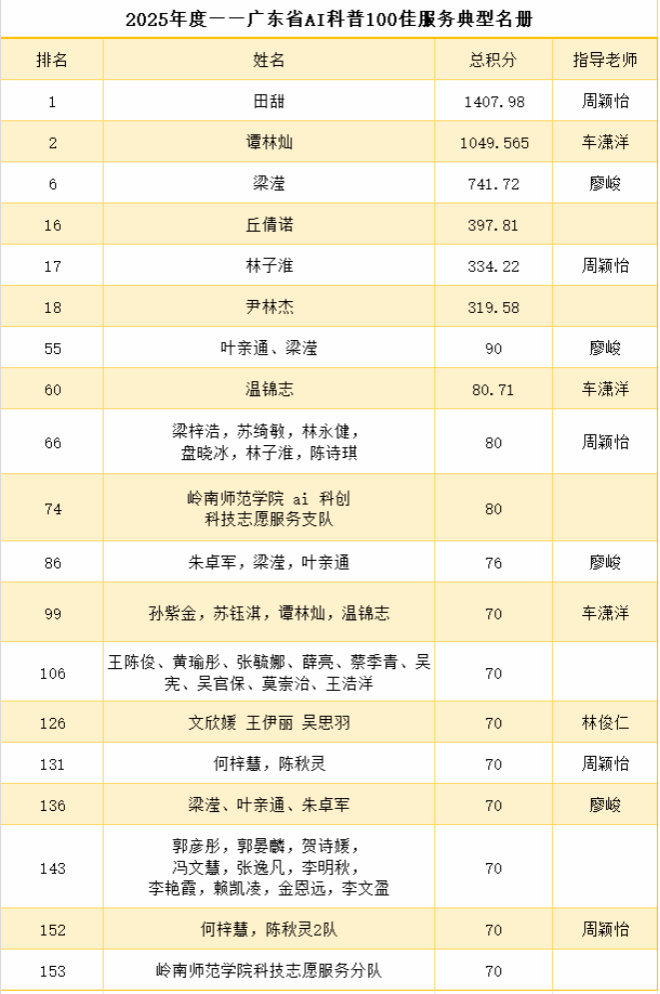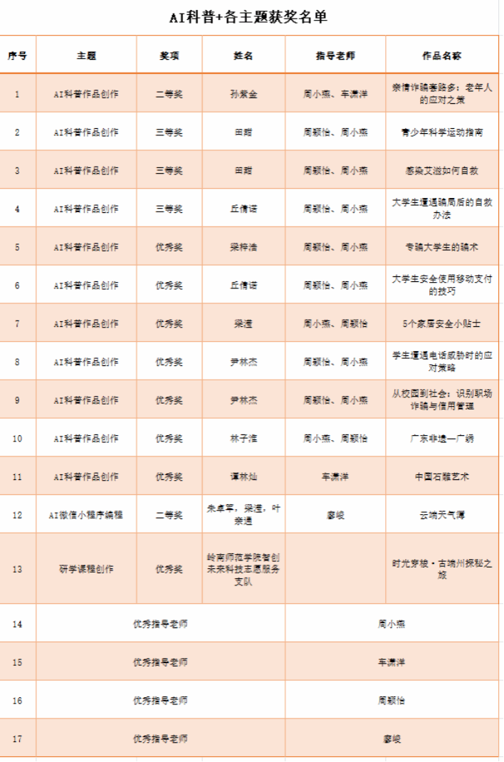 近日,从广东省科学技术普及志愿者协会传来喜讯,在刚刚落幕的广东省首届“AI科普+”创意与应用大赛中,我院学子表现卓越,凭借出色的创新能力和扎实的技术功底,在AI科普作品创作、AI微信小程序编程、创意与应用、AI科普100佳服务典型、优秀指导老师等全部赛道中均有斩获,成绩斐然,充分展现了我院在人工智能与科学普及交叉融合领域的育人成果。